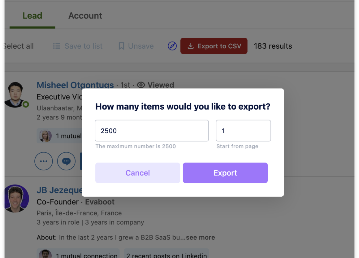 Quickly export large people search results from Sales Navigator.